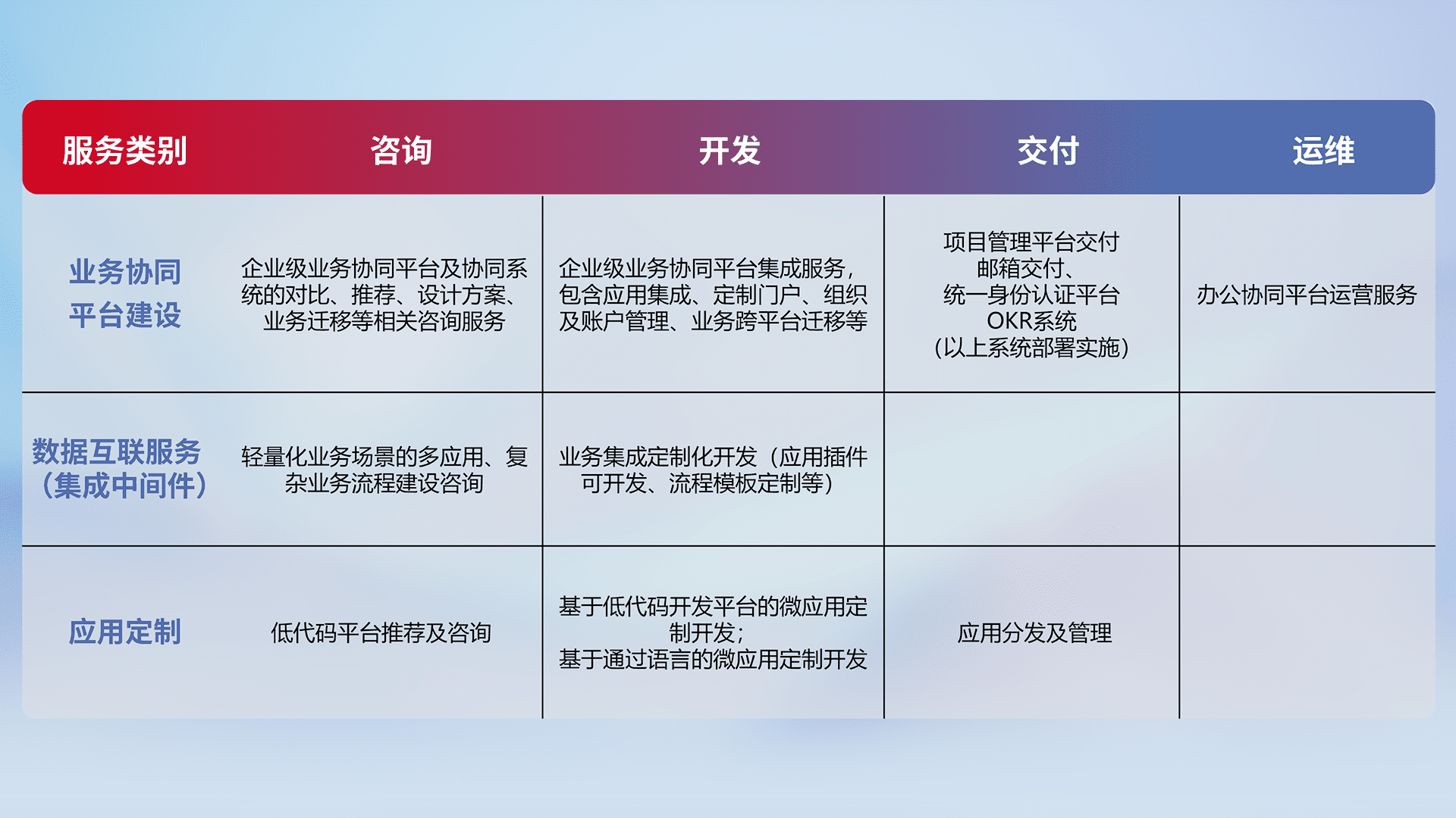 针对钉钉、、、、企微、、IDaas等平台级产品提供产品的规划、、、方案、、交付、、、定制化开发等服务,,,实现如统一协同办公、、、、智能客户服务、、混合会议管理、、、智能数据查询、、、、等业务场景,,,实现数字化转型。。。